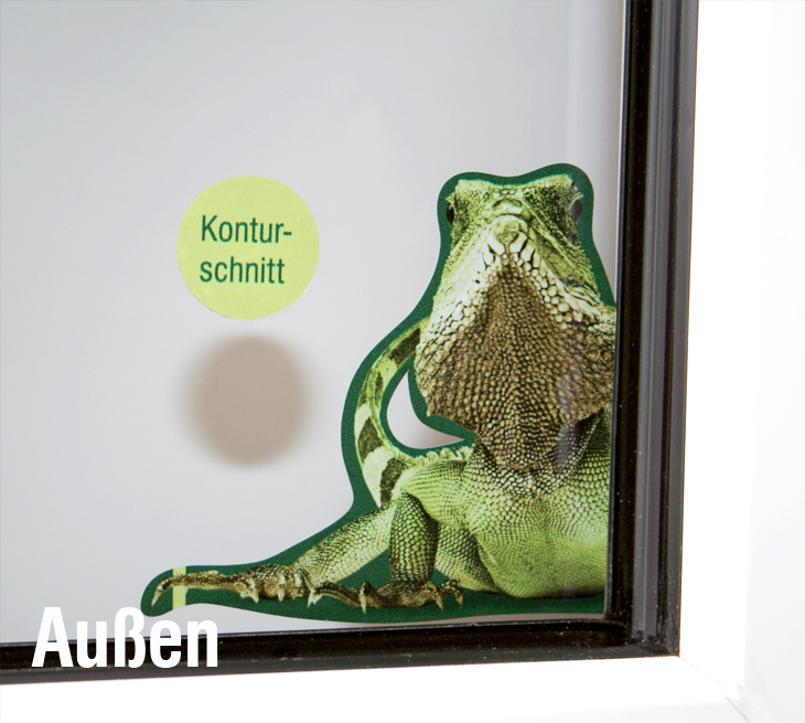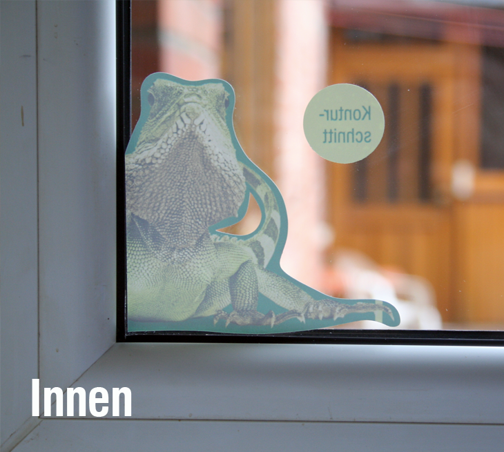 von innen an eine Scheibe geklebt, können Sie Ihr Motiv von der Fensteraußenseite